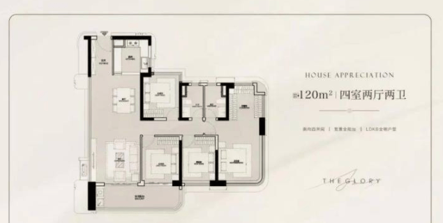 :120㎡四房两厅两卫,作为主力户型,使用率高达126%,四开间朝南,深受二胎家庭喜爱,货量充足。