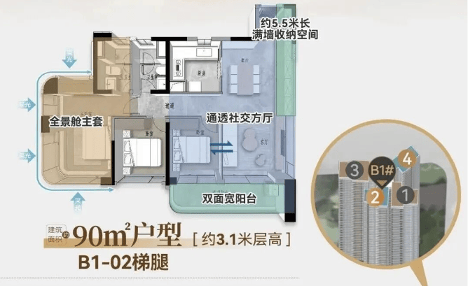 :90㎡三房两厅两卫(北地块B1栋),因总价低、使用率高(105%)、天河主城少见,备受刚需关注,库存紧张。