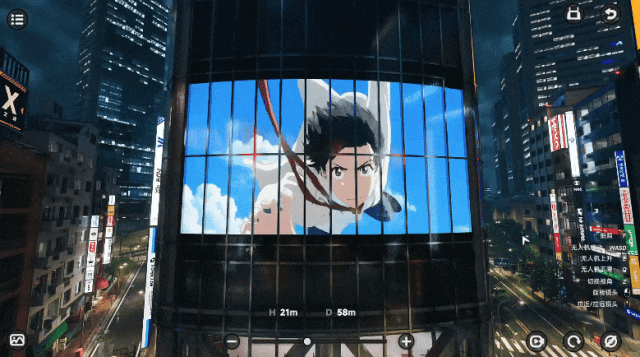 与此同时,城市中还藏着不少值得驻足的细节。像是在商场的外墙上,你甚至能看到大屏幕在播放《天气之子》。