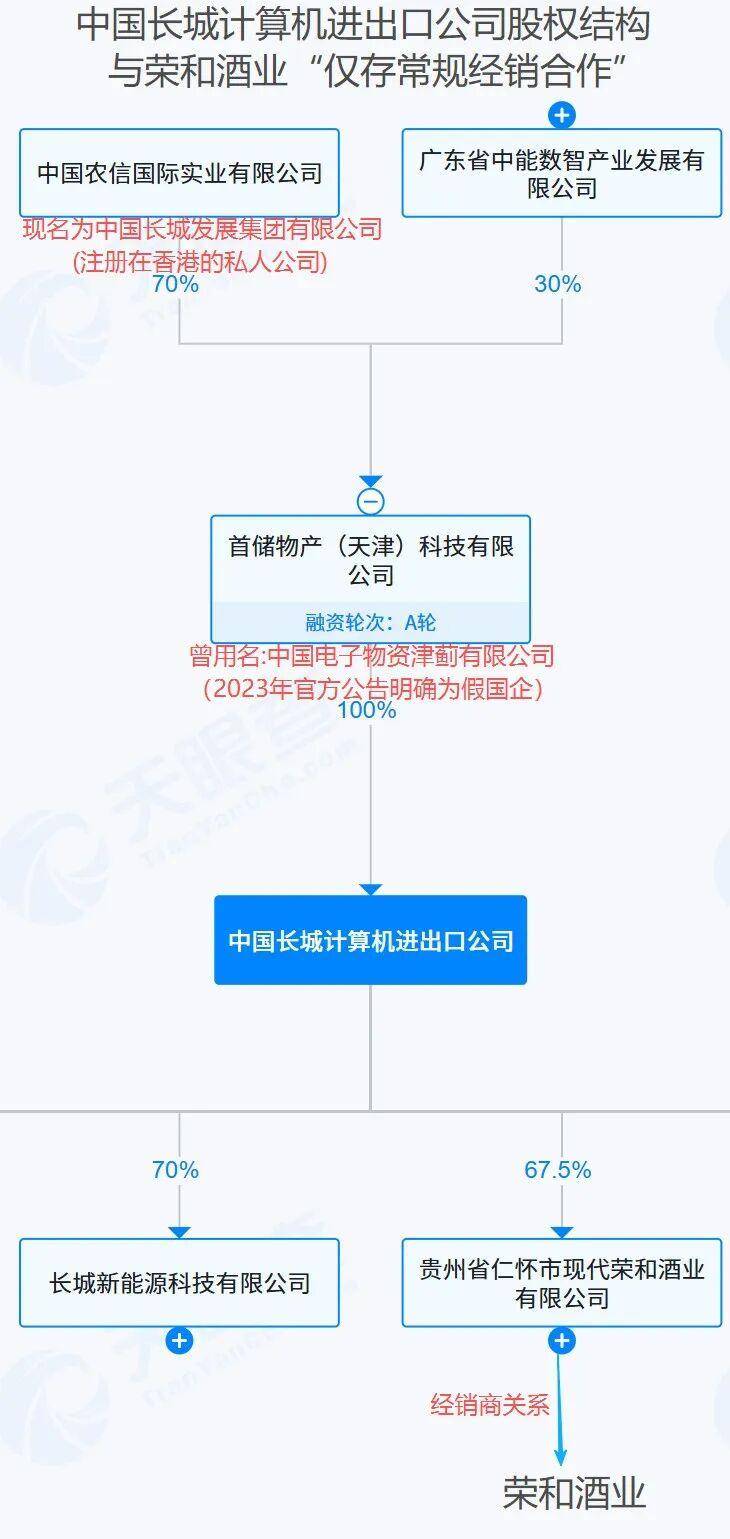 2026年4月17日,贵州省仁怀市茅台镇荣和酒业有限公司(下称荣和酒业)声明撇清与“长城易趣”的关系,称仅与贵州省仁怀市现代荣和酒业有限公司(下称现代荣和)合作开发系列产品,双方无股权关系,仅存常规经销商合作协议。